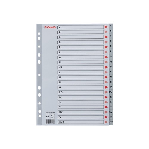 Szürke színű regiszter. Nagyméretű téglalapok az előlapon a tartalom feltüntetésére. Megerősített lefűzőrész az előlapon A-Z felirattal rendelkező regiszter fülek a dokumentumok gyors eléréséhez Hagyományos, 11-lyukú lefűzőrész A4 méret 0,12 mm vastag PP alapanyag Katalóguskód: 35876