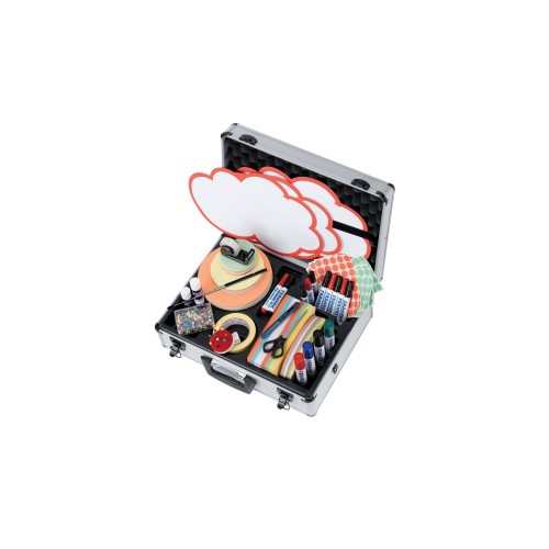Zárható, robusztus alumínium bőrönd. Súly a tartozékokkal együtt: kb. 6 kg. A bőrönd levehető hordszíjat és tartozékok széles választékát tartalmazza: 5 db. moderációs felhők 25 x 42 cm 500 db. moderációs kártyák téglalapok 20,5 x 9,5 cm, 6 színben válogatott 200 db. moderációs kártya ovális 19 x 11 cm, 6 színben válogatott 200 db. moderációs kártyák ? 9,5 cm, 6 színben válogatott 150 db. moderációs kártyák ? 14 cm, 6 színben válogatott 150 db. moderációs kártyák ? 19,5 cm, 6 színben válogatott 520 darab egyenként piros és zöld jelölőpontok 10 flipchart jelölő (6x fekete, 4x piros) 4 jumbo marker (piros, zöld, kék, fekete) 1 db Papírolló, ragasztó fólia adagolóval, maszkoló szalag, 2 ragasztórúd, tűpárna, vágó, lézermutató 300 tűs kerek fejjel Méret SZxMxM: 48 x 16 x 37 cm.