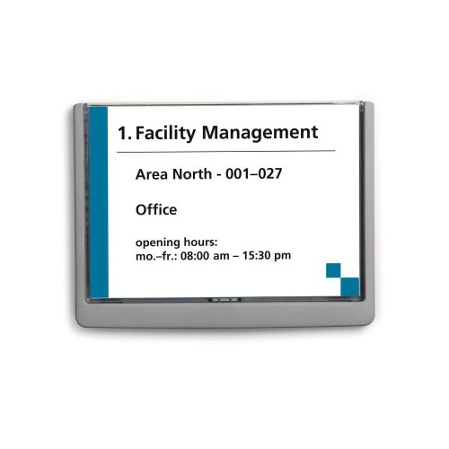 Irányítótábla, stílusosan megtervezett, lekerekített sarkokkal, így a modern design funkcióval párosul. Az insertek könnyedén cserélhetők az átlátszó panel kihúzásával. Ideális megoldás olyan helyeken, ahol az információkat gyakran kell cserélni, mint például hotelekben, konferencia termekben, kórházakban. Nyomtatható insertek külön kaphatók. Katalóguskód: 51744