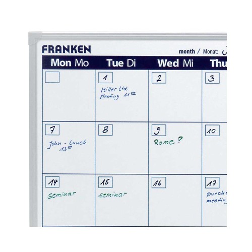 A kiszállított tábla sérülésmentes állapotáról a futár távozása előtt győződjön meg, mert annak állapotáról utólagos reklamációt nem áll módunkban elfogadni, megértésüket köszönjük!Ez a havi tervező megjeleníti az egész hónap tervezését, valamint egy áttekintő oszlopot a következő hónapra is. A feladatok tervezése egy teljes hónapra látható. Egy nap mérete 96 x 98 mm, biztosítja az információk átláthatóságát. Mágneses, írható, szárazon törölhető. Írószertartóval szállítjuk. Katalóguskód: 30782