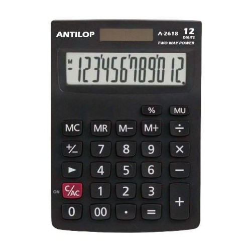Antilop A2618 fekete asztali számológép 12 számjegyű nagy kijelző, memória funkció, százalékszámítás, haszonrés számítás, 00, előjel váltás, vissza léptetés és alapműveletek. Működési mód: napelem+elem. Méret: 140 x 100 x 28 mm. 100db/karton Katalóguskód: 1708