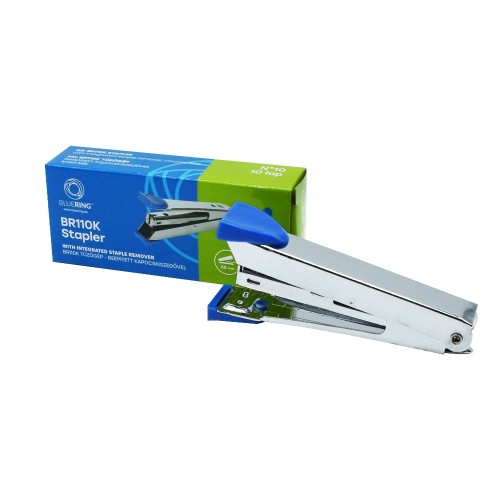 "Krómacél test, színes ujjpárnákkal a végeken, beépített kapocskiszedő, tűzési mélység 55mm. Használható kapocsméret: No.10. Egyszerre fűzhető lapok száma: max.10 lap. Használjon BLUERING No.10 tűzőkapcsot. 300db/karton" Katalóguskód: 2186