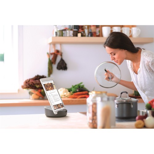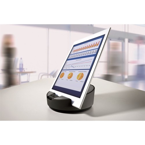 Praktikus, prémium minőségű tablettartó. Két pozícióba állítható, így dolgozni és prezentálni is lehet rajta. 360 fokban körbeforgatható, mely bármely pozícióban fixálható. A tablettek védőtokkal és védőtok nélkül is elhelyezhetők benne. Teljesen stabil. Csúszásmentes. Méret: 149 x 59 mm (átmérő x magasság) Katalóguskód: 30525