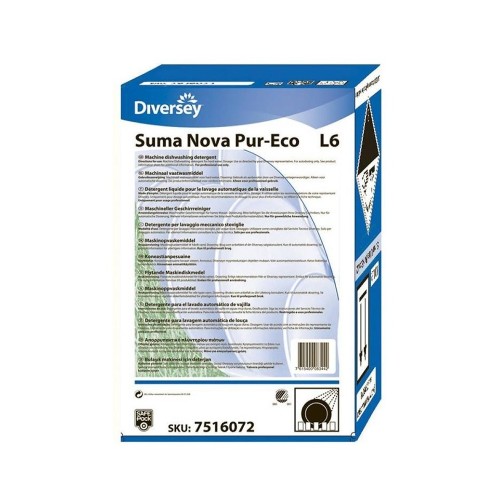 Diversey SUMA Nova Pur-EcoL6 folyékony gépi mosogatószer köz. kemény vízhez, 10L Suma Nova Pur-Eco L6 egy erősen lúgos folyékony mosogatószer, mely kiválóan alkalmas egy és több tartályos mosogatógépekhez. Maró lúg és vízkövesedést gátló adalékok keverékét tartalmazza, amely által kiválóan eltávolítja a szennyeződéseket.