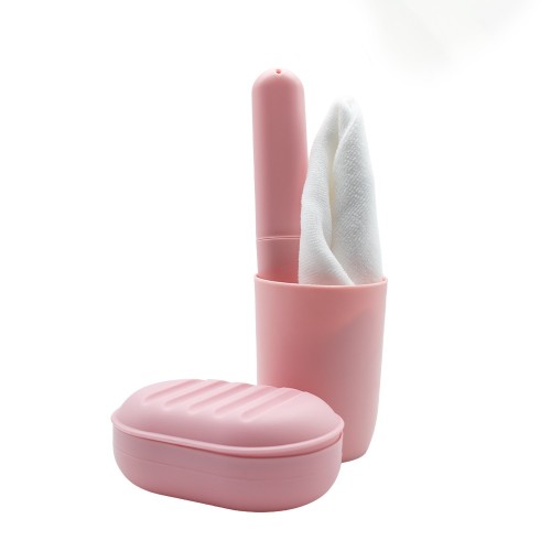 Tisztasági csomag összehúzható, zsinóros átlátszó zsákban. Tartalma: műanyag pohár, szappantartó, fogkefetartó, kéztörlő.
