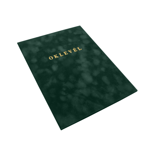 A4 méretű oklevelek tárolására alkalmas, plüss borítás, nyitott állapotban, jobb oldalon 4 szatén szalaggal. Borítón arany "OKLEVÉL" nyomattal méret: 233x312x7mm Katalóguskód: 44074