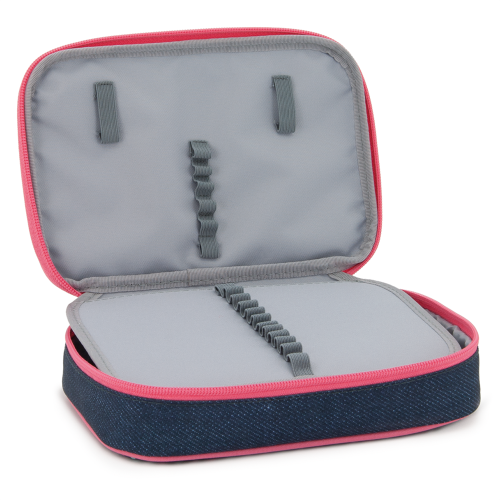 Többszintes, töltetlen, cipzáras tolltartó. Belül textillel bevont merev lapokkal, gumis kialakítással 30 ceruza számára az írószerek tárolásához és egy cipzáras belső zsebbel.