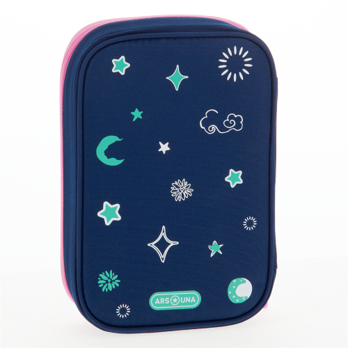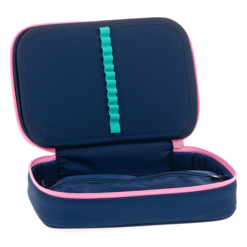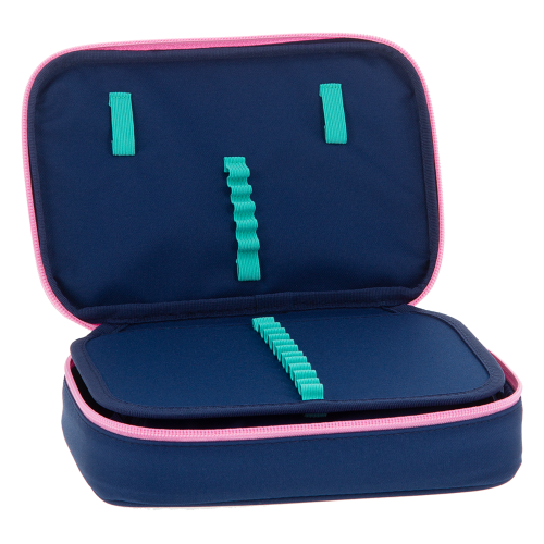 Többszintes, töltetlen, cipzáras tolltartó. Belül textillel bevont merev lapokkal, gumis kialakítással 30 ceruza számára az írószerek tárolásához és egy cipzáras belső zsebbel.