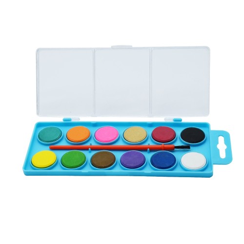 Megfelelő pigmentáltságú vízfesték készlet, praktikus műanyag dobozban. Könnyen oldódó és egyenletesen fedő festék, iskolai felhasználásra. Katalóguskód: 54497