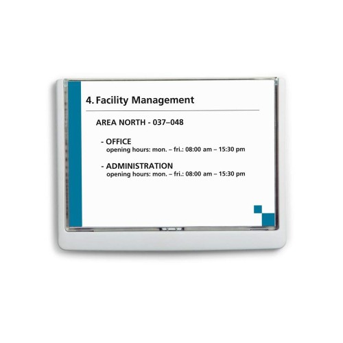 Irányítótábla, stílusosan megtervezett, lekerekített sarkokkal, így a modern design funkcióval párosul. Az insertek könnyedén cserélhetők az átlátszó panel kihúzásával. Ideális megoldás olyan helyeken, ahol az információkat gyakran kell cserélni, mint például hotelekben, konferencia termekben, kórházakban. Nyomtatható insertek külön kaphatók. Katalóguskód: 51745